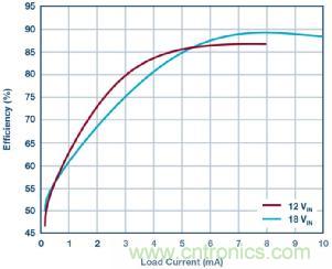 图 5:图 4 所示解决方案在各种不同输入电压条件下的效率。