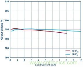 图 4 显示一款完整的 4 V~18 V 输入至 800 V 输出解决方案,其能够提供高达 10 mA 的输出电流。当输入为 18 V 和负载电流为 10 mA 时,该反激式转换器可实现 88.2% 的峰值效率。图 5 显示各种不同输入电压下的效率曲线;图 6 显示了卓越的负载调节性能。另外,该解决方案采用的组件较少。