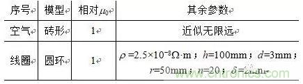 以XOY平面为圆平面,Z轴为高度建立线圈圆环模型,空气模型为砖形,如图1所示。通过布尔操作中的over运算将空气介质与线圈浇筑在一起。材料属性和模型参数设置见表1。