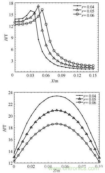 图8可以看出:发射线圈半径的差异对磁场强度有着明显的影响。线圈半径从0.04m增加到0.06m过程中,当径向距离dx<r时,径向方向上的磁场强度在同一位置处随着半径增大而减??;当径向距离dx>r时,径向方向上的磁场强度在同一位置处随着半径增大而增大。原因是在线圈内部,半径越小,则磁通越密集,导致磁场强度反而增大。