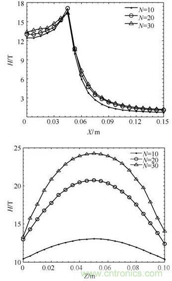 图9:不同匝数下磁场强度H分布曲线