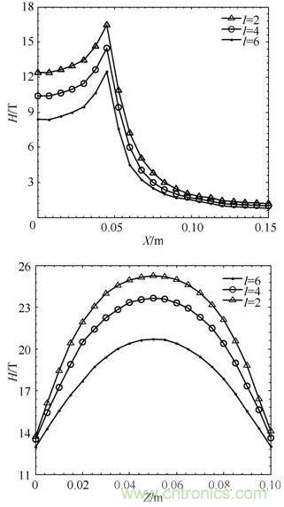 当l一定时,径向距离上的磁场强度在半径范围外随着距离增大显著减小。纵向距离的磁场强度随着距离增大先增大后减小。在l=Rm处,磁场强度均有最大值,同时,匝间距的增大使得线圈的总高度增加,磁场覆盖范围增加。