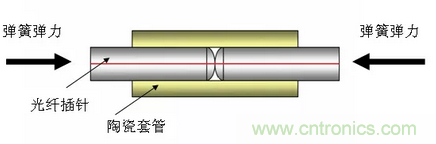 传统的光纤连接器均为接触式光纤连接器,其工作原理如下图所示,通过高精度的插针套管实现光纤的精准对接(MT型插芯是通过两对高精度导销导孔实现),通过两端的弹力实现两端端面的紧密连接,从而实现光路的可靠连接。