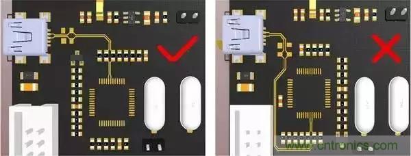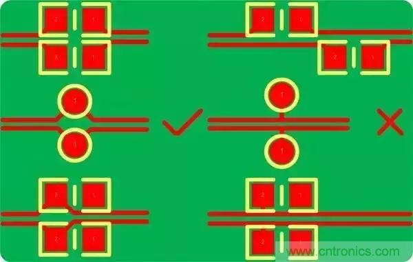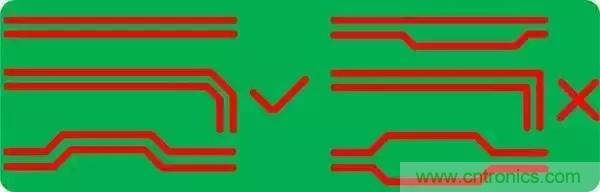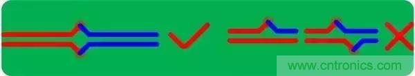 3.对称平行走线,这样能保证两根线紧耦合,避免90°走线,弧形或45°均是较好的走线方式(√为合理的方式,×为不合理方式);