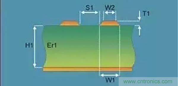 因为差分阻抗影响差分信号的眼图、信号带宽、信号抖动和信号线上的干扰电压。差分线阻抗一般控制在90(±10%)欧姆(具体值参照芯片手册指导),差分线阻抗与线宽W1、W2、T1成反比,与介电常数Er1成反比,与线间距S1成正比,与参考层的距离H1正比,如下图是差分线的截面图。