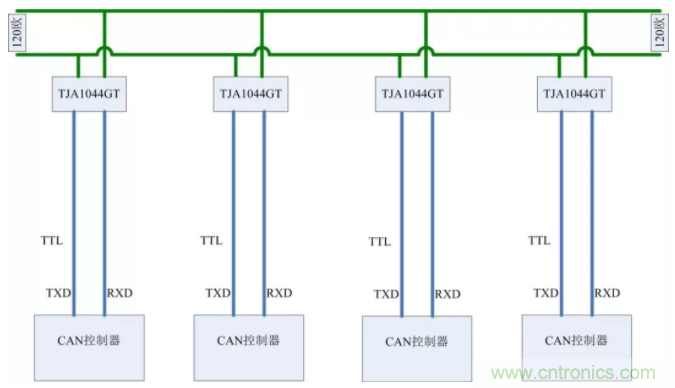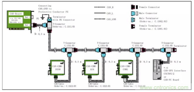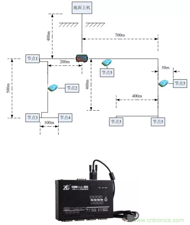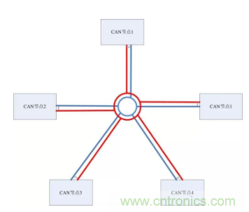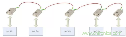 采用CANBridge中继器,CANHub集线器等组网设备进行分支。这些设备每路都具备独立的CAN控制器,所以可以将每段形成独立的直线拓扑,方便施工。