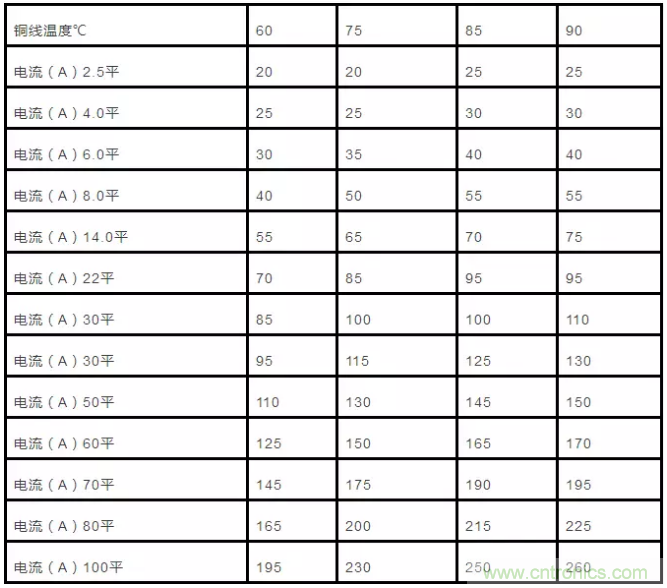下面是铜线在不同温度下的线径和所能承受的最大电流表格。