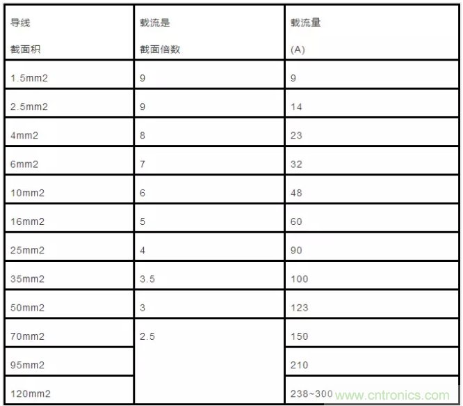 2.5mm’及以下的各种截面铝芯绝缘线,其载流量约为截面数的9倍。如2.5mm’导线,载流量为2.5×9=22.5(A)。从4mm’及以上导线的载流量和截面数的倍数关系是顺着线号往上排,倍数逐次减l,即4×8、6×7、10×6、16×5、25×4。
