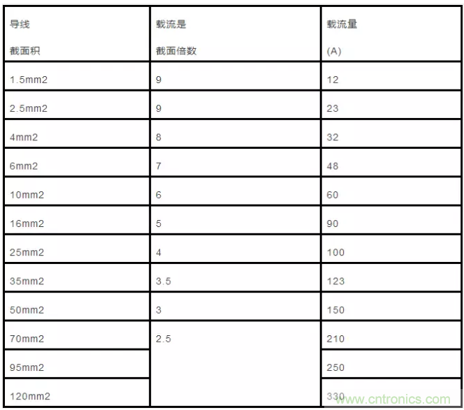 35mm”的导线载流量为截面数的3.5倍,即35×3.5=122.5(A)。从50mm’及以上的导线,其载流量与截面数之间的倍数关系变为两个两个线号成一组,倍数依次减0.5。即50、70mm’导线的载流量为截面数的3倍;95、120mm”导线载流量是其截面积数的2.5倍,依次类推。