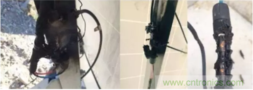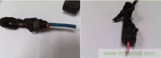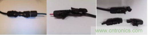 而在失效的样品中就有两个是用了不同的电缆,且外径相差悬殊。图11 中的左侧图连接器一侧用的是光伏电缆(黑色),外径为6mm,而另一侧则是用的 普通线缆(蓝色),外径仅为4mm。将蓝色电缆端的螺帽拧开后发现可能由于密封不够竟采用了红色塑料片填充。在该种情况下连接器是很难保证其密封性,因此,在户外应用时有可能会进水进尘,从而破坏绝缘性能,进而引发火灾。
