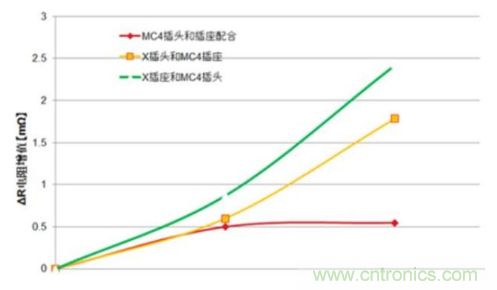 此外,尽管有些连接器在与MC4互插后电阻增加不明显,但这同样不能保证互插连接器在经过几个月甚至几年之后电阻的稳定性。这也就是大部分不同厂家的连接器在互插并使用一段时间后才发生问题的原因。
