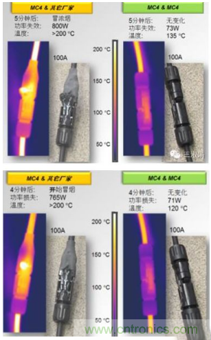 而与之形成鲜明对比的是MC4自身公母头插合后的测试结果:除了温度有初始的90℃升高到135℃及功率损失由69W升高到73W外,外观并无明显的变化。