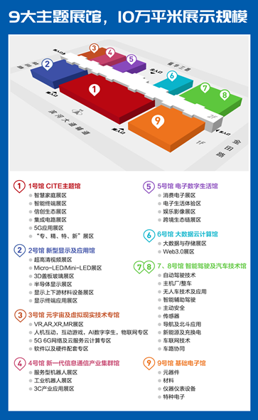 本届中国电子信息博览会使用深圳会展中心的全部9个展馆,其中1号馆为CITE主题馆,2号馆为新型显示及应用馆,3号馆为元宇宙及虚拟现实技术专馆,4号馆为新一代信息通信产业集群馆,5号馆为大数据云计算馆,7、8号馆为智能驾驶及汽车技术馆,9号馆为基础电子馆。