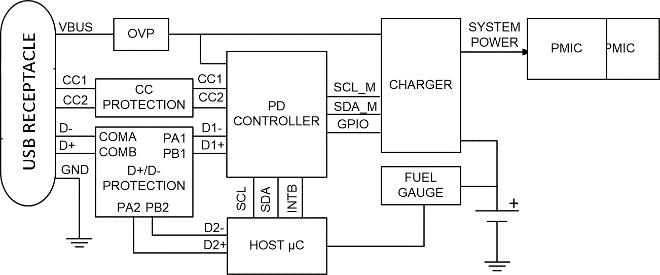 当存在VBUS时,它为充电器、系统和其余??楣┑?,同时对电池充电。当VBUS断开时,电池为系统供电。使用USB-C电缆时,CC1和CC2引脚决定端口连接、电缆方向、角色(role)检测和端口控制。D+/D-线是标准的USB-C通信线,以480Mbps的速度处理数据,并受到D+/D-?;ぷ爸玫谋;?。PD控制器实现供电协议。