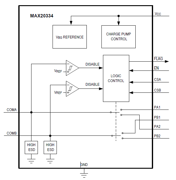所有引脚均采用了ESD?;そ峁梗苑乐乖诖砗妥樽肮讨性馐芨叽铩?kV(人体模型)的静电放电。COMA和COMB(图2和图3)进一步受到高达±15kV(人体模型)、±15kV(IEC 61000-4-2中描述的气隙放电方法)和±8kV(IEC61000-4-2中描述的接触放电方法)的ESD?;?,且不会造成损坏。ESD结构在正常运行和设备断电时均可承受高ESD。即便在ESD事件之后,此IC也会继续工作,而不会发生闩锁。经测试,该IC可受到-30V至+45V(IEC61000-4-5)的浪涌保护和高达+20.5V的过压?;ぁ?/p>