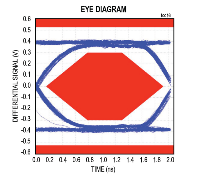 从图5的眼图可明显看出,弯曲的蓝线与禁止的红色禁区保持接近最大(close-to-maximum)的距离,数据信号具有良好的完整性。保护IC的高带宽使信号升降时间和抖动的下降幅度最小,从而产生良好的误差容限,这对于通过USB一致性测试很重要。