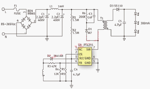下图是采用PT4215的3W LED灯杯的典型应用电路。驱动电路采用反激架构,工作在DCM模式。采用无光藕设计,方案简洁可靠,成本低廉。驱动电路能够接受85VAC~265VAC输入范围,输出电流300mA,驱动3颗1W LED串联的灯串。