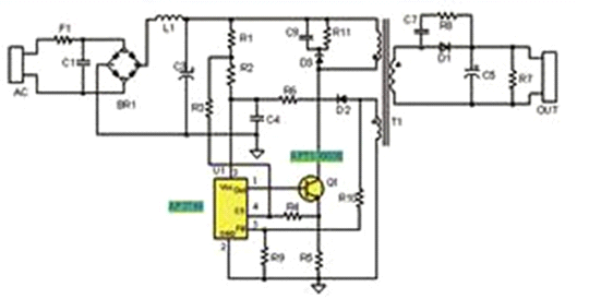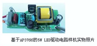 1. 基于最新的LED专用驱动芯片AP3766,采用原边控制方式,无须光耦和副边电流控制电路,实现隔离恒流输出,电路结构简单。通过电阻R5检测原边电 流,控制原边电流峰值恒定,同时控制开关占空比,保持输出二极管D1的导通时间和整个开关周期时间比例恒定,实现了输出电流的恒定。