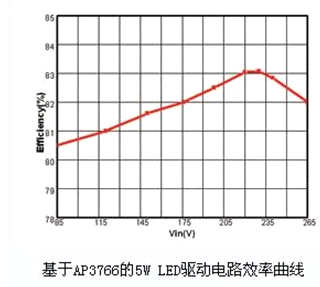 图2为该方案的5W应用电路样机实物照片。图3是基于AP3766的5W LED驱动装置实物照片。图4为基于AP3766的5W LED驱动电路满载效率随交流输入电压变化曲线。图5为基于AP3766的5W LED驱动电路满载输出IV特性曲线。