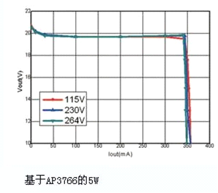 2. AP3766采用专有的“亚微安启动电流”技术,仅需0.6μA的启动电流,因此降低了启动电阻R1和R2上的功耗,提高了系统效率。典型5W应用效率大于80%,空载功耗小于30mW。