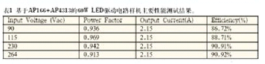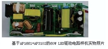 AP1661是一款工作于临界导通模式下的有源功率因数校正控制芯片,可广泛应用于开关电源、LED驱动和电子镇流器的预调整变换器控制。该芯 片内部包括1个启动定时器可满足待机应用要求,1个能实现接近于1的功率因数的单象限乘法器和1个零电流检测??槿繁A俳缍闲绞焦ぷ?。AP1661的图 腾柱驱动输出能够为外部MOSFET或IGBT提供最大600mA驱动电流和800mA关断电流能力。采用了先进的双极型互补金属氧化物半导体设计和制造 工艺,具有低启动电流,低工作电流和低功耗的特点。AP1661同时具有完善的?;すδ?,包括过压保护、带有滞后的输入欠压锁定和乘法器输出嵌位以限制开 关最大峰值电流。图7为该方案60W应用电路样机实物照片。图8为应用该方案LED直管灯实物照片。