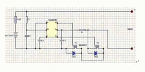 ---在正常充、放电时,电路中控制IC的C0与D0脚高电平,V1、V2都导通。充电电流从Input+流入,经熔断器向电池充电,经V1、V2后由Input-流出。正常放电时,电流经Input-及V2、V1流向电池负极,其电流方向与充电电流方向相反。由于V1、V2的导通电阻Rds(ON)极小,此状态下的消耗电流为μA级因此损耗很小。