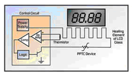 安装一个独立于加热元件控制器的PPTC器件,就能够?;CD和加热器的控制电路,避免温度过高而造成损坏。如图1所示,PPTC器件一般放在电源和加热器之间的连接线路中,并置于LCD热传导回路中,这样一来,LCD产生的热就能传导到PPTC器件上了。当LCD的温度达到某一个预定温度时,PPTC器件的电阻迅速上升,发热元件中的电流便随之下降。一旦故障排除,并且重新上电,这个电路还会恢复到正常的工作状态。