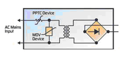 金属氧化物压敏变阻器具有高的通流和能量吸收能力,快的响应速度,低廉的成本,非常适合在电源端进行过压?;?。PPTC过流保护器件的额定工作电压也是交流240V,允许最高达265V的间歇性电压,可以与交流电源输入线路中的压敏变阻器安装在一起。