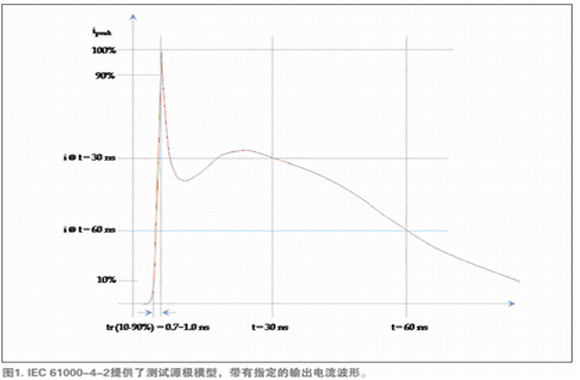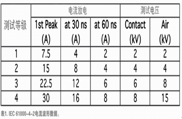 目前最常用的ESD抗扰度标准是IEC 61000-4-2标准。该系统级标准规定了一个源极模型,后者包含一个150pF电荷存储器(在330 ohm源极电阻后面)和一个特定的电流放电波形(图1和表1)。与旧标准规定的源极相比,大电荷存储器和低源极电阻使源极模型能交付更多能量和更大电流。
