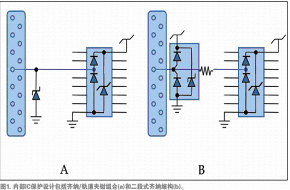 例如,与信号输入相关的IC焊垫的特点是齐纳二极管和结型钳位二极管连接供电轨(图1a),或者两段式齐纳钳位二级管连接地面(图1b)。多供电轨的IC需要使用轨道夹钳阻止轨道在高速电流瞬变时扩散。
