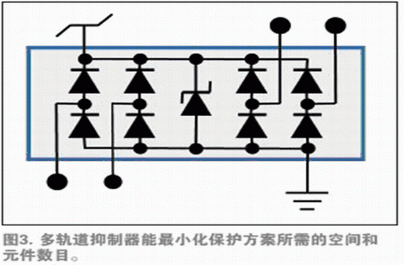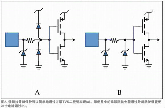 如果产品要在输入/输出线中承受某些额外阻抗(如在单端逻辑输入时经常出现的情况),可以通过在外部夹钳和IC引脚之间增加一个电阻器,使外部和芯片上二极管之间的电流有助于外部防护(图2b)。一些TVS二极管供应商在单一小型组件包里提供两个结型二极管和一个TVS夹钳,进一步减少组件数目、降低装配成本,避免互连偏离。这些组件包同样适用于多轨道情况——单一的组件包为几条普通供电轨提供?;ぃㄍ?)。
