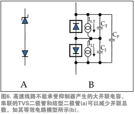 例如,如果某元件仅需要单向运行,抑制器制造商可以通过一系列TVS二极管和结型二极管形成低电容抑制器(图6a)。在断开状态下,这种结构的纯电容等于