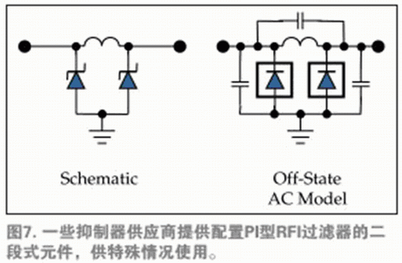 类似图1b中的片上二段夹钳结构也应用于外部夹钳,在相同设备中同时实现瞬态超电压防护和电磁干扰(EMI)过滤。这种布局是基本的π形网络,同时,TVS二极管的寄生电容有利于完成EMI过滤。电阻和感应网络均可直接利用,满足各种实体电路层对于信令的具体要求(图7)。抑制器供应商通常按照通信标准在选择器向导中对元件加以区分,确保适当的带宽和某些特性阻抗的应用。