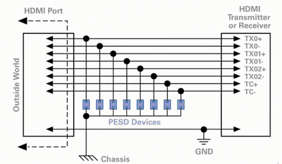 F2:带PESD器件的典型HDMI电路示意图(基于HDMI规范1.2)