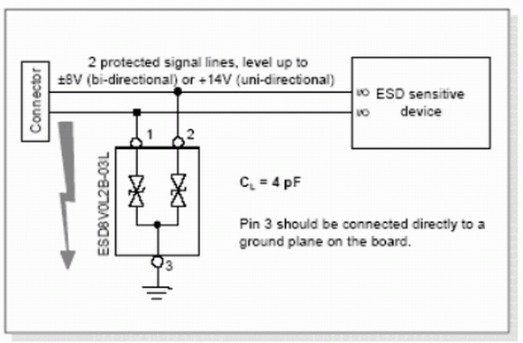 如图4所示,USB2.0传输链路的差分数据线应连接至ESD8V0L2B-03L的管脚1和管脚2上。二极管的管脚3接地。由每个二极管产生的线路电容都是4pF,差分线间的电容为2pF。
