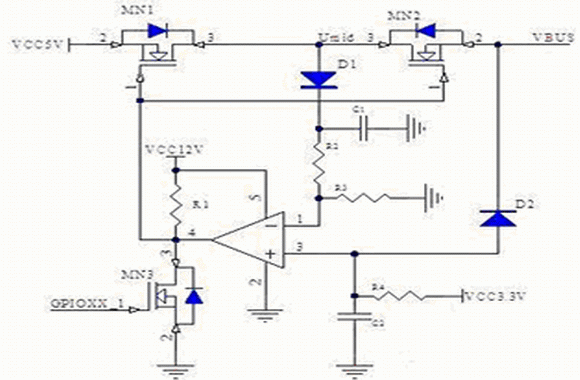 即当VBUS小于(VCC5V—UD1)R2/(R2+R3)— UD2,比较器便会将MOS管关断。