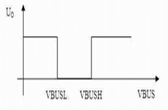 当U- > U+ 时,比较器输出电平发生反转,由式(1)、(4)、(7)、(8),设此时VBUS的值为VBUSL,有: