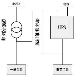 如图一所示,这个是石化行业典型的两电源的UPS构架,由两路电源,一个隔离变压器、一台UPS组成。UPS采用双电源回路输入,UPS主电源由电源1提供,UPS旁路电源有电源2提供,同时UPS设置一个脱机维修旁路,允许UPS在故障维修或者更换时,系统仍然能够正常工作。同时DCS系统中的负载分为两个级别,即一般负载和重要负载,重要负载(一级负荷)由UPS系统直接供电,一般负载(三级负荷)由电源2经隔离变压器后供电。