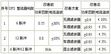 因此,在选择UPS的同时,必需考虑相应的功率因数及谐波改善措施。目前的主流的UPS的改善主要包括移相、无源滤波器、有源滤波器、混合式滤波几种方案。其中移相是指在6脉冲整流器基础上,增加一个移相变压器后再增加一个6脉冲整流器,可以抑制谐波?;中巢ǜ纳魄榭鋈缦卤硭荆?br />