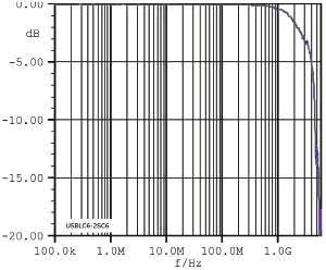 图3中截止频率大约为5GHz,远离USB480Mb/s收发器的正常工作频率,因此,USB收发器可以安全工作。