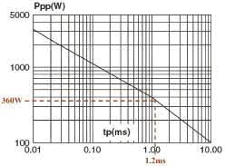 以SMAJ24A为例,从产品数据表摘取这些参数与图11的曲线进行比较,发现SMAJ24A符合ISO7637-2脉冲2测试的要求,可承受长达1.2ms的360W指数脉冲,这个数值远远高于ISO7637-2脉冲2电涌强制的4μs时长。