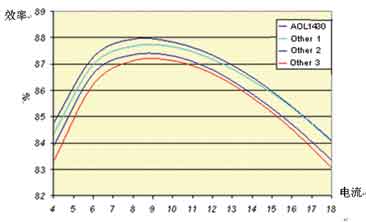 注意到图2中,除了栅极结构,其他的部分就是标准的采用Trench工艺的MOSFET。栅极被分割成上下两个部分,下部分用一些特殊的材料屏蔽起来,下部分在内部和上部分的栅极相连,而栅极的屏蔽层被连接到源极,从而减小漏极栅极米勒电容。用这种技术设计的MOSFET如AOL1464,其Vds为30V,Vgs在10V条件下Rds(on)为6.2mΩ,而其Crss只有20pF,极大地减小了开关过程中米勒平台的持续的时间,降低了开关损耗。AOL1430,其Vds为30V,Vgs在10V条件下Rds(on)为2.5mΩ,而其Crss为50pF。图3中,下管采用AOS的AOL1428,上管采用AOL1430和其他厂家目前Crss最低的器件的效率曲线,可见,上管采用AOL1430具有非常高的效率。注意:输入电压12V,输出电压 1.7V,开关频率300kHz。