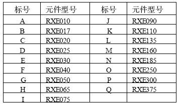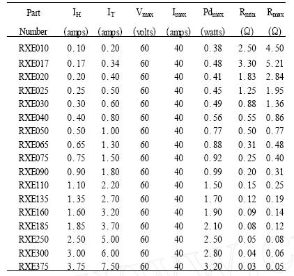 PolySwitch元件有多种系列产品,其产品特性各不相同。以常用的RXE系列元件为例,其20℃时的电气特性如表1所示。