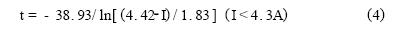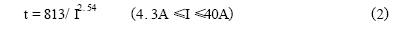 由表1可知,RXE系列PolySwitch元件所能承受的最大电流为40A。该点与临界点之间为曲线的直线部分。设动作时间为t(秒),故障电流为I(安),考虑到横轴、纵轴均为对数坐标,两者之间应具有如下数学关系: