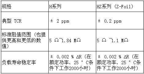 - H系列的最大TCR为±2ppm/℃,Z-Foil HZ系列的最大TCR仅有±0.2ppm/℃
