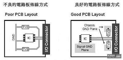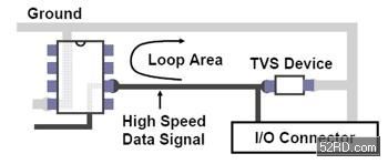 幅射噪音与受射频信号影响的问题可以透过尽可能缩减由高速资料与接地线所形成的迴路区大小来降低,一个解决迴路区最小化问题的有效方法是在印刷电路板设计上加入接地面,特别是在走线长度相对较长时,虽然将TVS元件与晶片间的距离尽量加大可以提供隔离,但却可能增加回路区的面积大小,请参考(图三)。