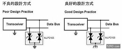 (图一) TVS二极管的箝位效能可以透过将元件安排在接近输出入连接点,并将连接TVS的走线长度缩短而提高。