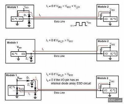 突崩式TVS二极管虽然拥有高突波规格,但相对较大的电容值使得这类元件成为负载切换开关与直流电源汇流排?;びτ玫慕霞蜒≡瘢喾吹?,二极管阵列适当的突波规格与较小的电容值则较适用于高速资料连接线的?;ぃ槐朗絋VS与二极管阵列通??梢越换ナ褂茫糠莸缏吩谘≡袷屎蠏裼玫脑痹蛐枰邢傅姆治?。(图四)描述了当存在一个电流可以透过资料线流经二极管阵列路径时所发生的向后驱动问题,如果VDD2大于VDD1,那么资料连接线有可能意外地提供电源给模组1,这个情况可能会造成逻辑晶片的电源启动问题,或是在断电后模组1上指示灯被点亮的异常状况。