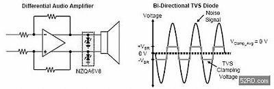 (图五) 双向式元件可以将噪音信号嵌位到0V的平均电压,降低音频放大器中的交流哼声与直流杂音。