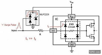 (图六) 电阻R会促使I1>>I2,确保大部分的突波能量会由外部二极管所吸收。
